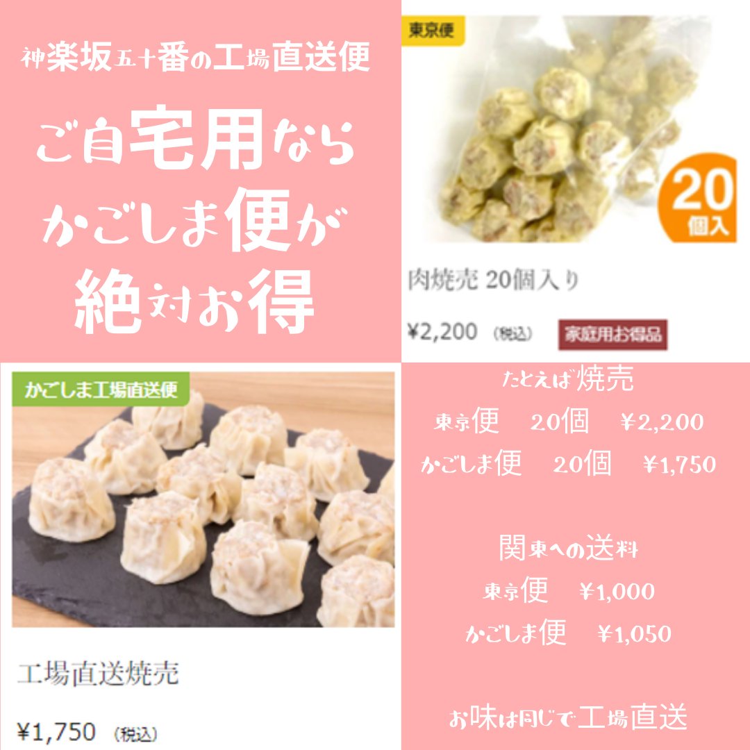北海道宛てでも,焼売20個で税送料込 かごしま便¥3,490,東京便¥3,600 かごしま便が #お得 です 特に送料もかごしま便は安いので信越、北陸、中部、関西、中国、四国、沖縄宛ては圧倒的にかごしま便がお得です。お味は東京も鹿児島も同じで #工場直送! store.50ban.jp/pages/kagoshi… #神楽坂五十番 #肉まん